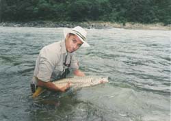 Jan Tinnemas (left) with son Nick and a friend, and his specimen trout
