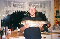 Jan Tinnemas (left) with son Nick and a friend, and his specimen trout