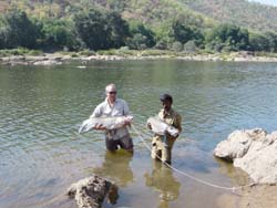 Jan Tinnemas (left) with son Nick and a friend, and his specimen trout